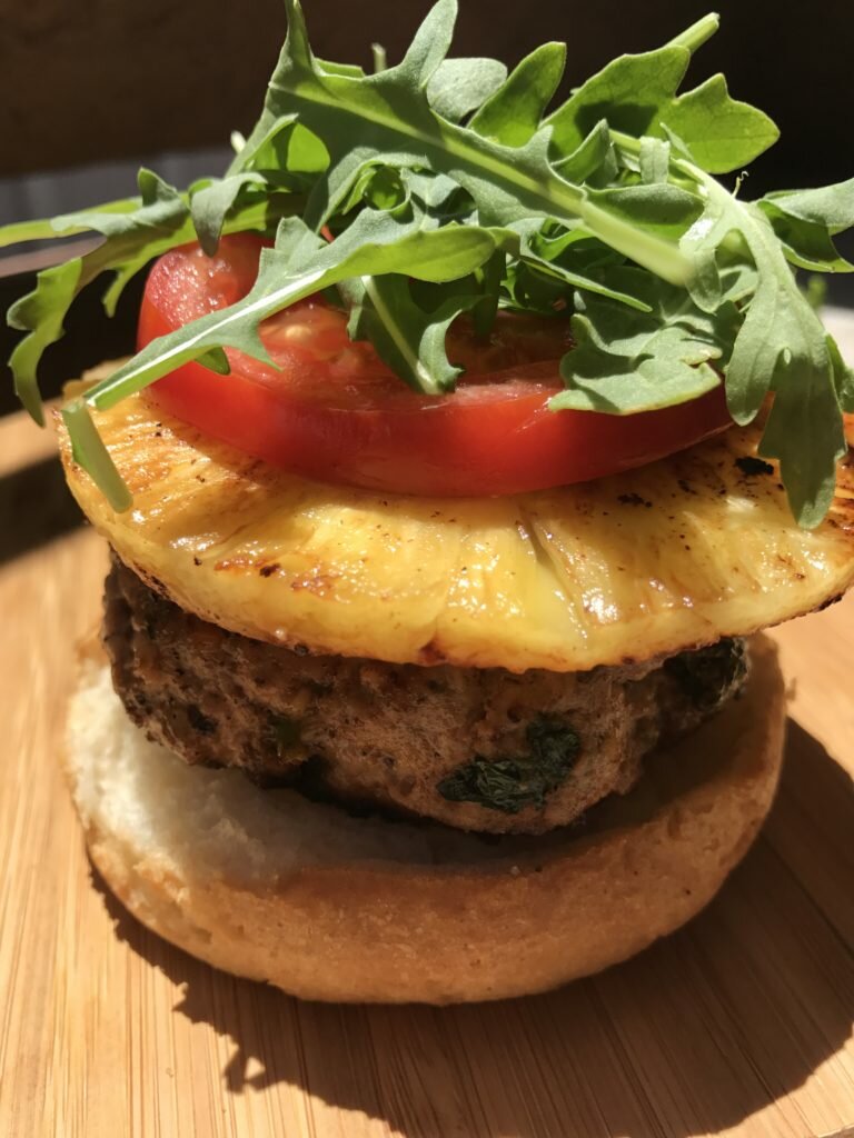 gluten-free bun, turkey and bacon burger with grilled pineapple and the fixings.